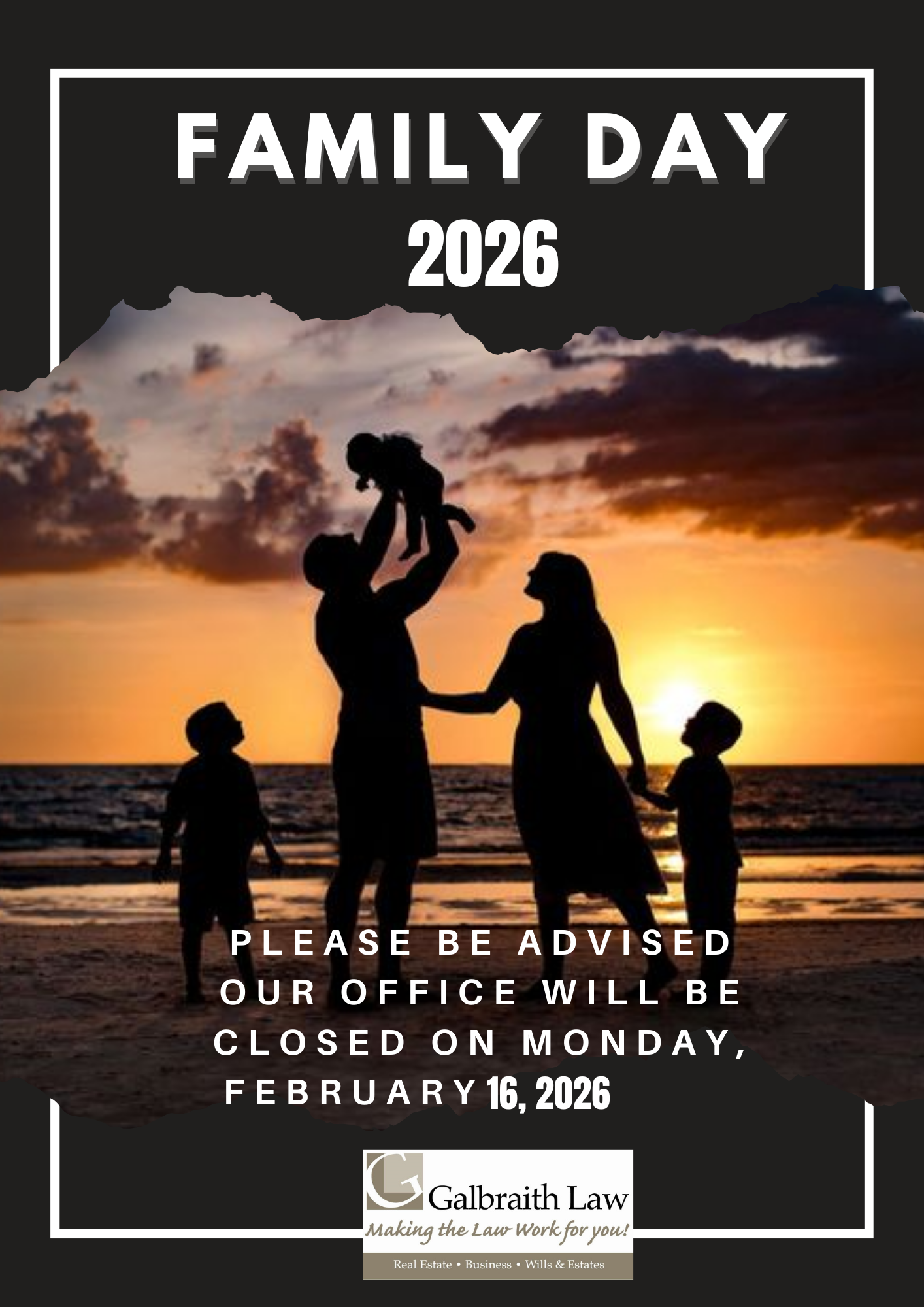 Please be advised that our office will be closed Monday, February 16, 2026 in celebration of Family Day 2026.